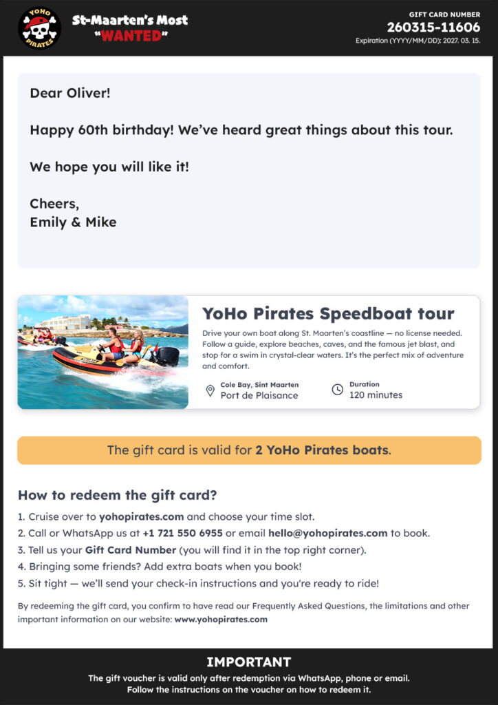 Each voucher has a unique code. Use it to book your YoHo Pirates tour via WhatsApp, phone, or email.